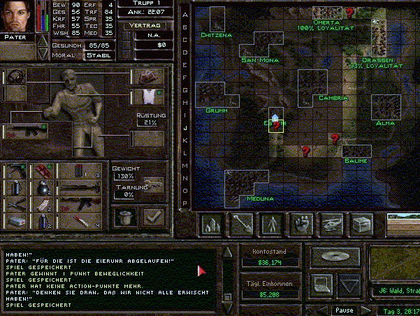 Und vor JEDE dieser Scheißtüren stellt sich irgendein Rindvieh, welches dort nicht wegzubewegen war, so dass keiner meiner Söldner den Sektor verlassen konnte. Da war nix zu machen. Aus der Map rausgehen, Zeitraffer nen Tag an, wieder reigehen und die Heinze standen immer noch da. Und warteten auf irgendetwas.