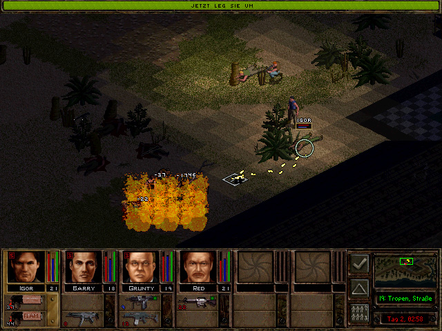 der andere screen zeigt, dass auch ein kleines Feuerchen an der richtigen stelle die hochintelligente ja2 gegner ki brutzeln lassen kann.